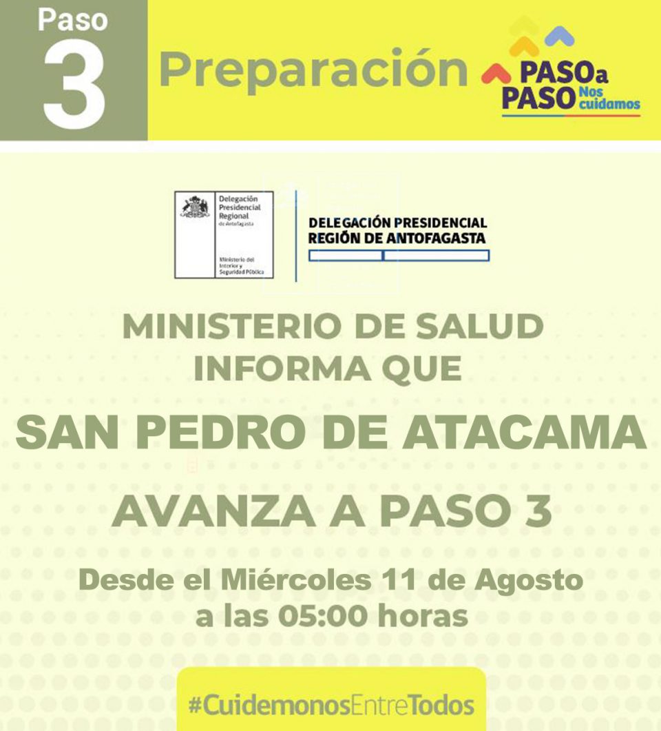 Durante el Balance Nacional Covid 19, las autoridades del Ministerio de Salud anunciaron el avance a Paso 3 de la comuna de San Pedro de Atacama.