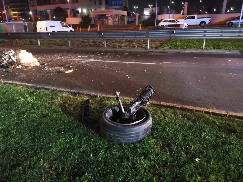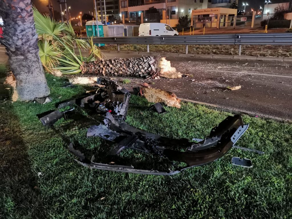 La magnitud del choque fue tal que el vehículo perdió uno de sus neumáticos junto a otras piezas que quedaron repartidas en la calzada. Así también, la palmera contra la que impactó el automóvil fue arrancada desde su ubicación.