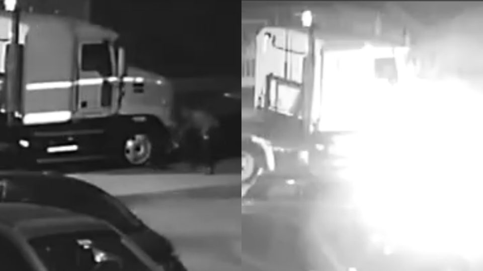 El video muestra como en primera instancia dos sujetos se acercan y observan el camión, uno de los cuales lleva en sus manos un objeto similar a un bidón.