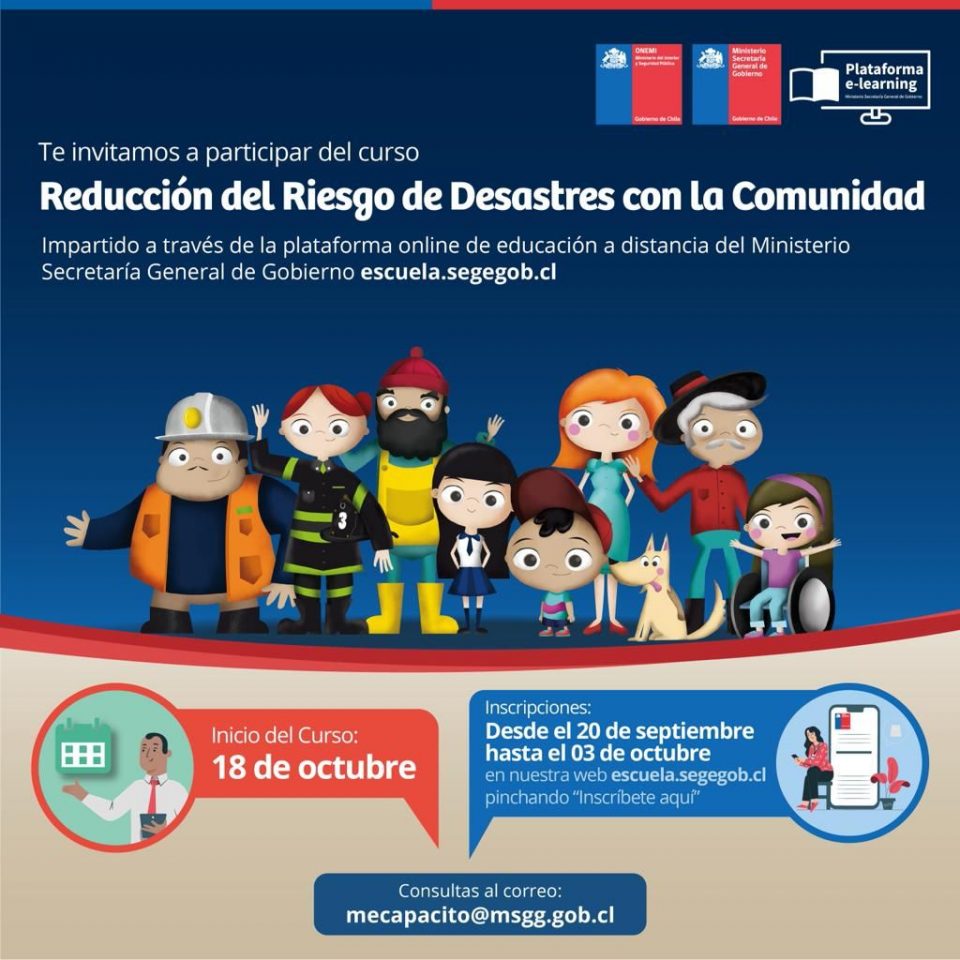 Con el objetivo de entregar conceptos y nociones básicas sobre gestión de desastres, prevención y preparación, es que el Ministerio Secretaria General de Gobierno (Segegob) en conjunto con la Oficina Nacional de Emergencia (ONEMI) llevarán a cabo el Curso E-learning “Reducción de Riesgo de Desastres para la comunidad”. Este programa se llevará a cabo a través de tres módulos, en el que los participantes podrán acceder a conceptos claves y podrán conocer e identificar diversas amenazas y acciones a desarrollar, para prevenir o prepararse ante eventuales emergencias o desastres, asumiendo un rol activo para aminorar éstos.