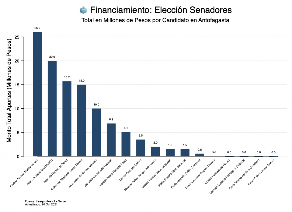 Con 26 millones Paulina Nuñez y con más de 15 millones Marcela Hernando, ambas diputadas en ejercicio en carrera al Senado, lideran el listado de campañas con mayores aportes en la región, en el primer y tercer lugar. En el segundo se encuentra el ex intendente Marco Antonio Díaz con 20 millones y en el cuarto lugar Katherine López con 15 millones. En contraste, el otro diputado en ejercicio que va al Senado, Esteban Velásquez, no registra aportes monetarios. Así lo reveló la plataforma tresquintos.cl que realiza análisis políticos con peras y manzanas.