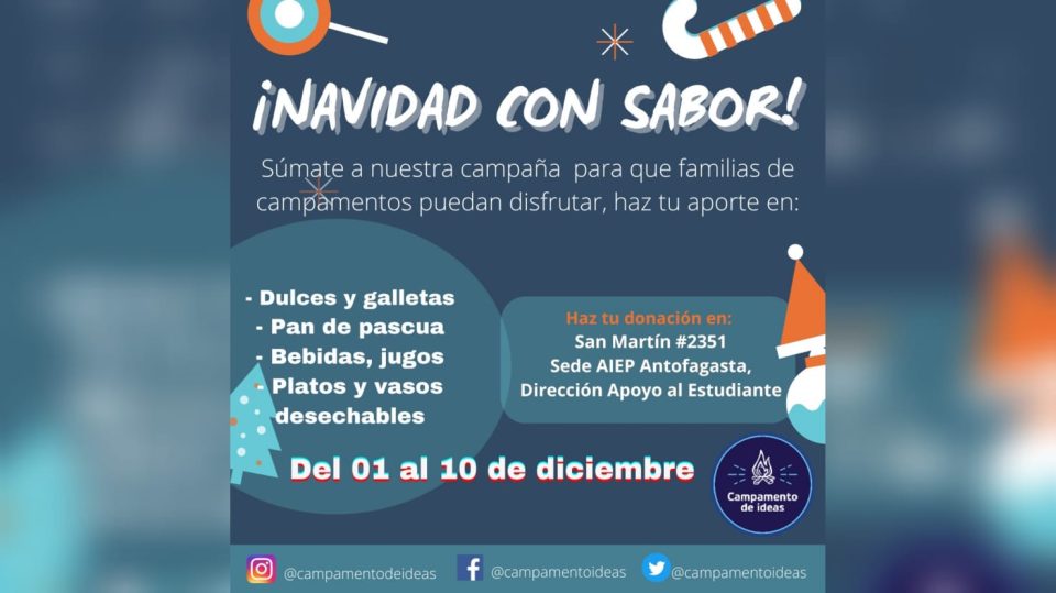 Es por esto que están invitando a la comunidad a cooperar con artículos como galletas, dulces, panes de pascua, vasos desechables, entre otros. Las donaciones se estarán recibiendo entre el 1 y 10 de diciembre en la sede de AIEP ubicada en la calle San Martin #2351.
