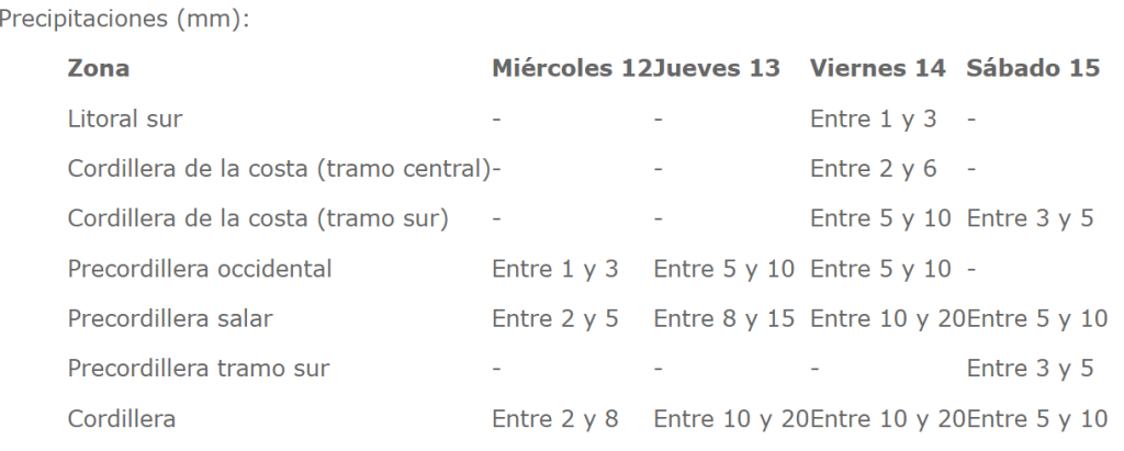 De acuerdo con la información proporcionada por la Dirección Meteorológica de Chile (DMC), mediante su Alerta Meteorológica CNA AA4/2022, indica que desde la tarde del viernes 14 hasta la tarde del sábado 15 de enero, se prevén precipitaciones moderadas a fuertes en corto periodo de tiempo en el tramo sur de la cordillera de la costa y precordillera de la Región de Antofagasta.