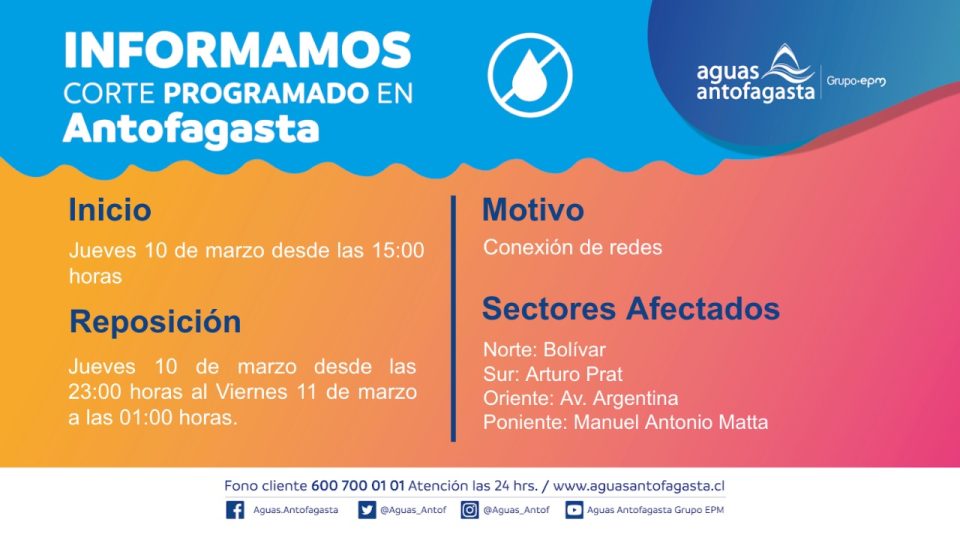 Como es habitual en estos casos, informamos a los vecinos que se verán afectados por esta discontinuidad, mediante la entrega de volantes informativos, contacto directo con las juntas de vecinos involucradas; con el objeto de que puedan estar preparados y tomar las medidas pertinentes. También tenemos a disposición de nuestros clientes toda la información del corte en nuestro sitio web, cuenta Twitter oficial @aguas_antof, además del servicio 24/7 de nuestro Call Center 600 700 01 01.