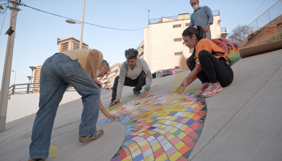 Paralelamente, la iniciativa tiene una profunda base de participación de la ciudadanía, ya que son los pobladores/as los/as que habitan este territorio y conocen las demandas más sentidas de su comunidad en materia de infraestructura del sector. “Esta obra de arte público contempla talleres de capacitación y de guiado de la realización de las piezas de mosaico al grupo de pobladoras artesanas de la Gran Vía, quienes con compromiso y dedicación están participando de este hermoso proyecto”, señaló el artista.