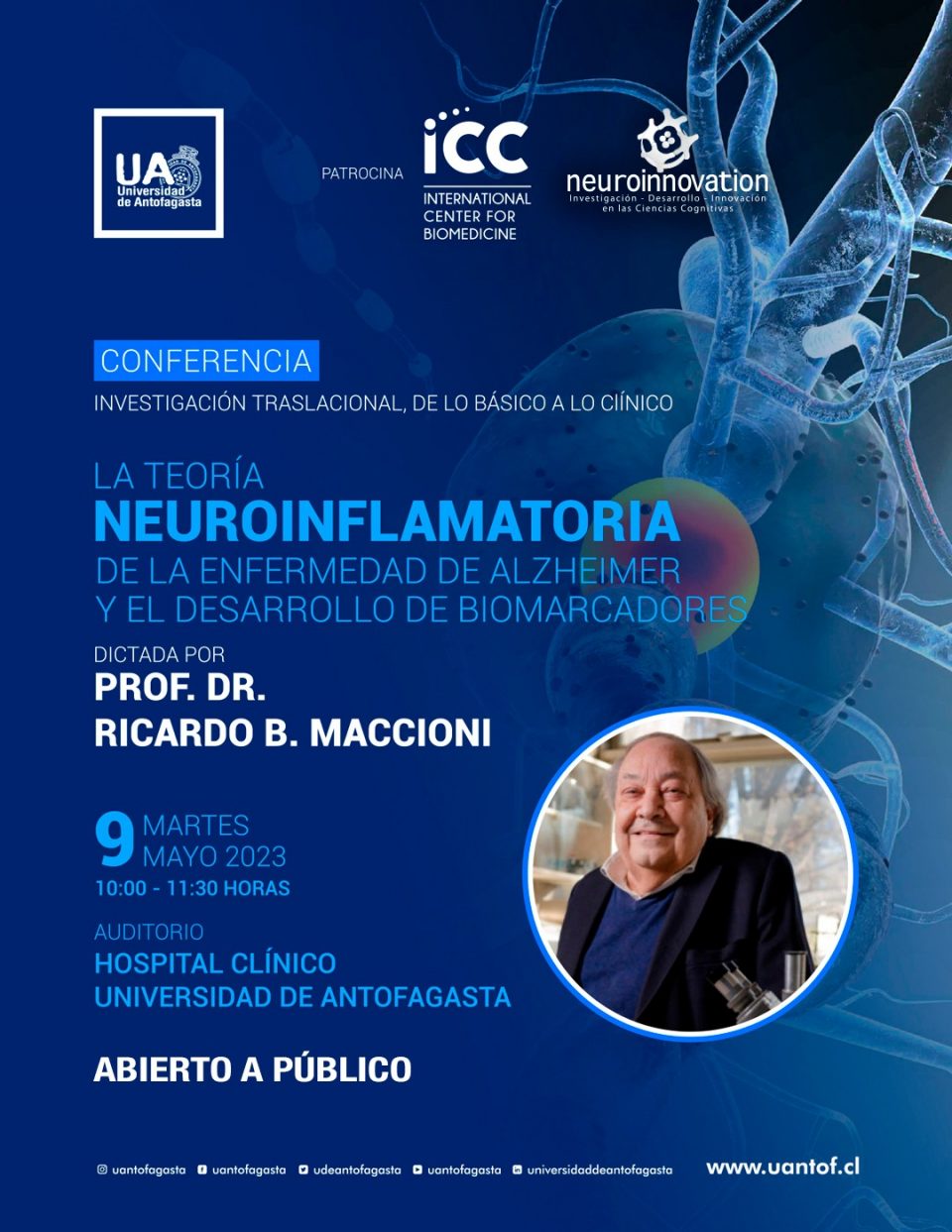 “Investigación traslacional, de lo básico a lo Clínico: la Teoría de la Neuroinflamación de la enfermedad de Alzheimer y el desarrollo de biomarcadores” es el nombre de la conferencia que este próximo martes 9 de mayo dará en Antofagasta el destacado Dr. Ricardo Maccioni, Neurocientífico de renombre internacional, quien dictará la charla en el auditorio del Hospital Clínico de la Universidad de Antofagasta desde las 10:00 para dar a conocer los avances sobre los biomarcadores no invasivos que permiten la detección temprana del Alzheimer, además de hablar de sus causas y posibles vías de tratamiento.