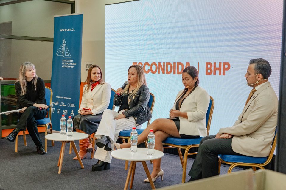El conversatorio “Sociedades inclusivas e integrativas”, contó con la participación del Rector del Colegio, Héctor Ramírez; la Especialista de Asuntos Corporativos de Escondida | BHP, Elizabeth Cameron; la primera vicepresidenta de la Asociación de Industriales Antofagasta, Pamela Garrido; y la operadora de planta de Escondida | BHP, Yasmina Villanueva.