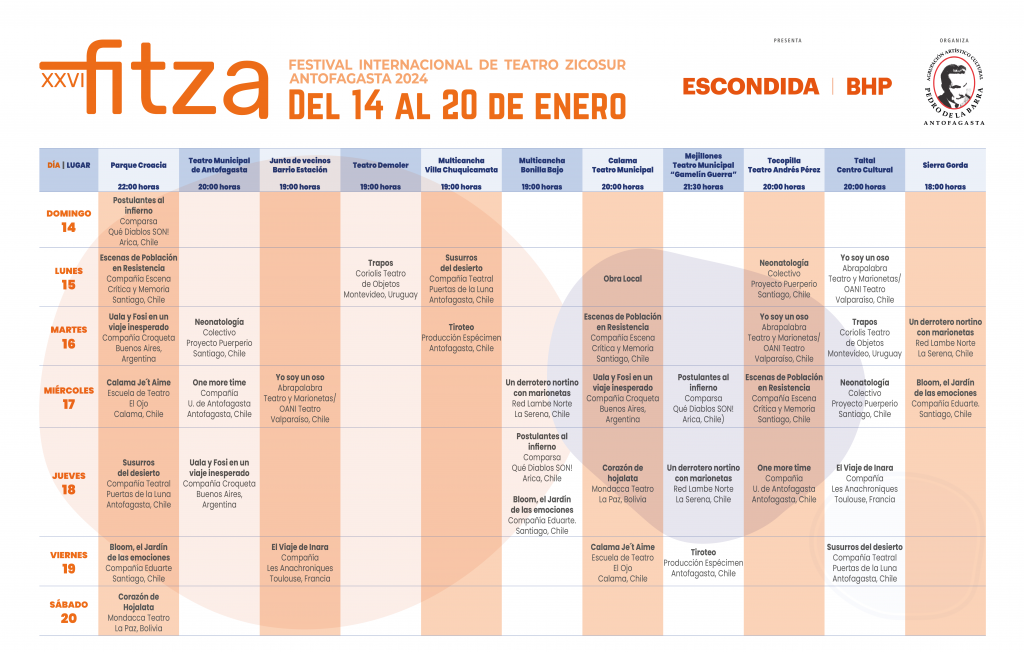Una fiesta cultural se vivirá durante la segunda quincena de enero en Antofagasta, Calama, Mejillones, Tocopilla, Taltal y Sierra Gorda, con la vigésima sexta versión del Festival de Teatro Zicosur (FITZA), organizado por la Agrupación Pedro de la Barra y presentado por Escondida | BHP.